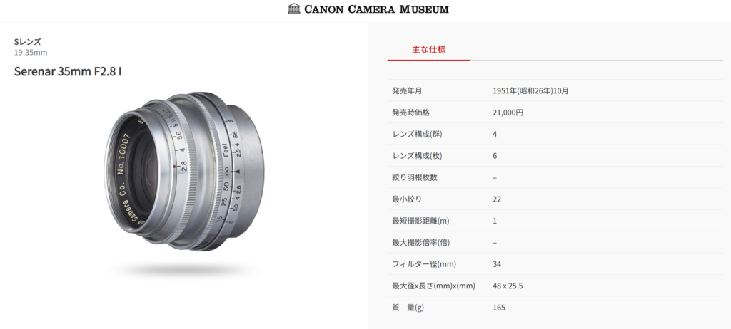 このレンズは、キヤノン製のライカL39スクリューマウントの広角レンズで、35mm f2.8のⅠ型が「Serenar 35mm F2.8 I」(1951年発売)として、Ⅱ型が「CANON 35mm F2.8 II」(1957年発売)として生産されたようです。