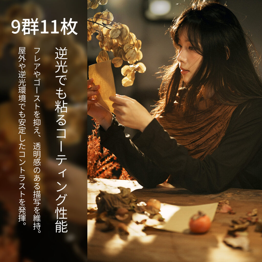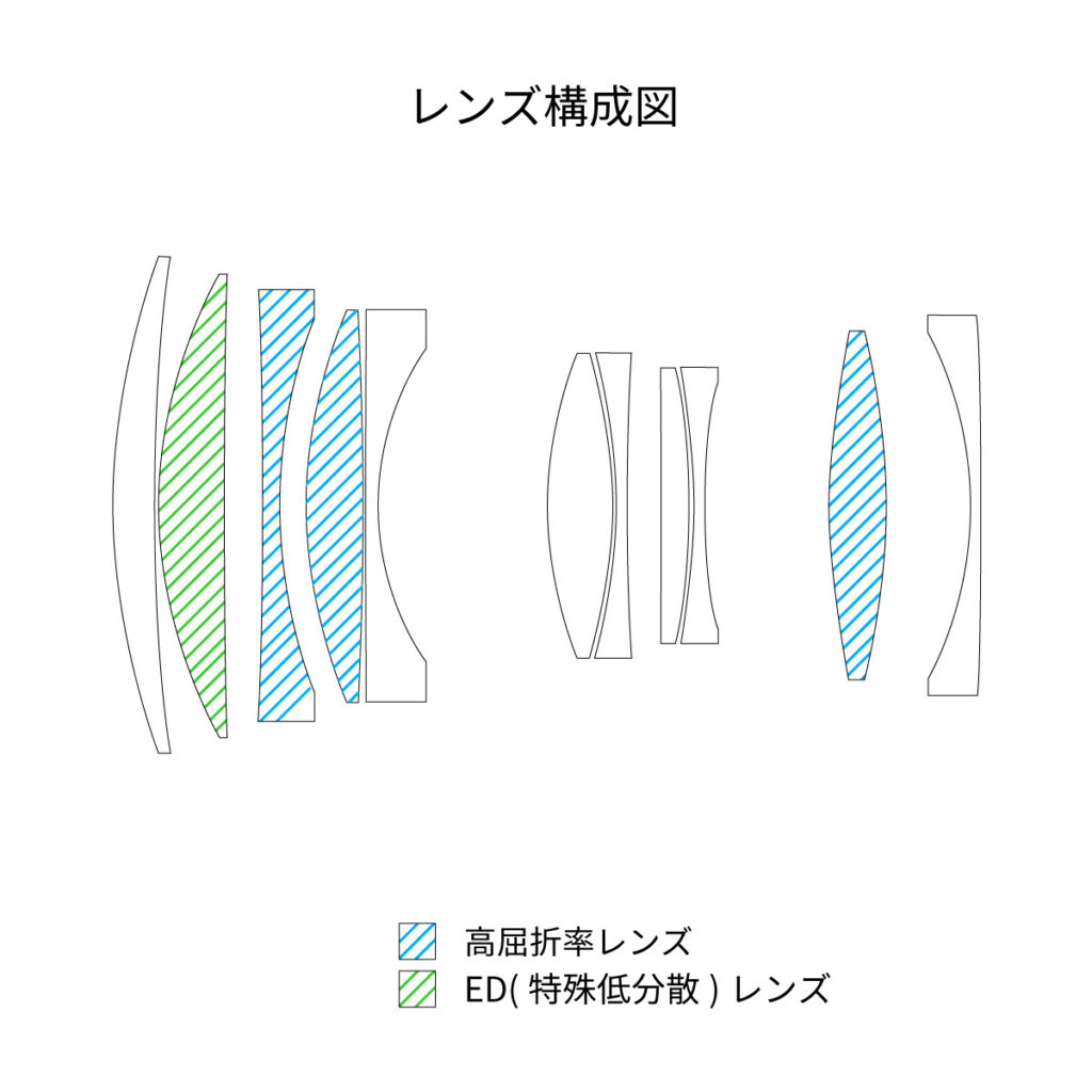 | レンズ構成 | 9群11枚 (高屈折率レンズ3枚3枚、EDレンズ1枚含む) |